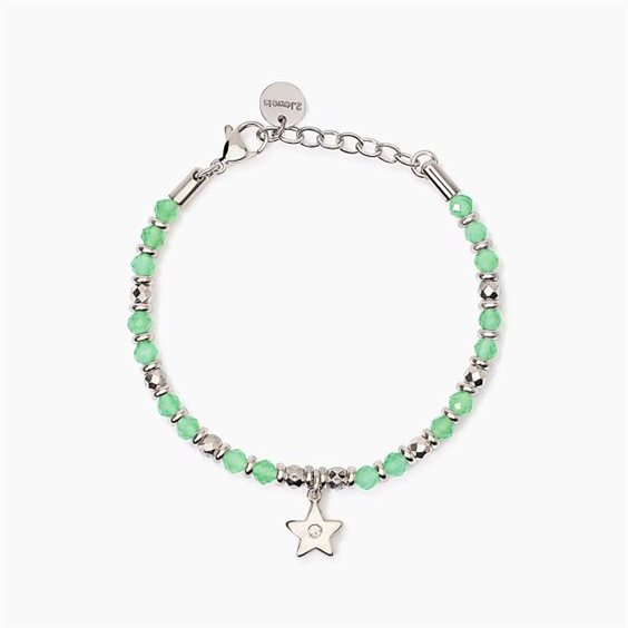 Bracciale in acciaio 316L con sfere diamantate Ø 4 mm, glass verde faccettato Ø 4 mm, ciondolo stella 11.5x13.5 mm e cristallo Ø 2 mm, lunghezza regolabile da 16 a 19 cm