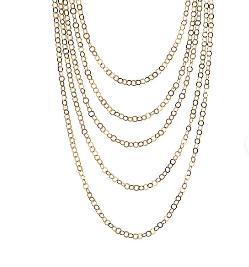 Collana multi-filo Bronzallure realizzata in lega Golden Rosé, placcata Oro giallo 18kt composta da cinque file graduate di maglia rolo piatta lucida. Lunghezza filo più corto 38.5 cm / filo più lungo: 60 cm. Chiusura a moschettone. Lega brevettata Golden Rosé Designed and made in Italy Nickel free, cadmium free Ipoallergenica Materiale: Golden rose Lunghezza (cm): 60 Peso (g): 19.8