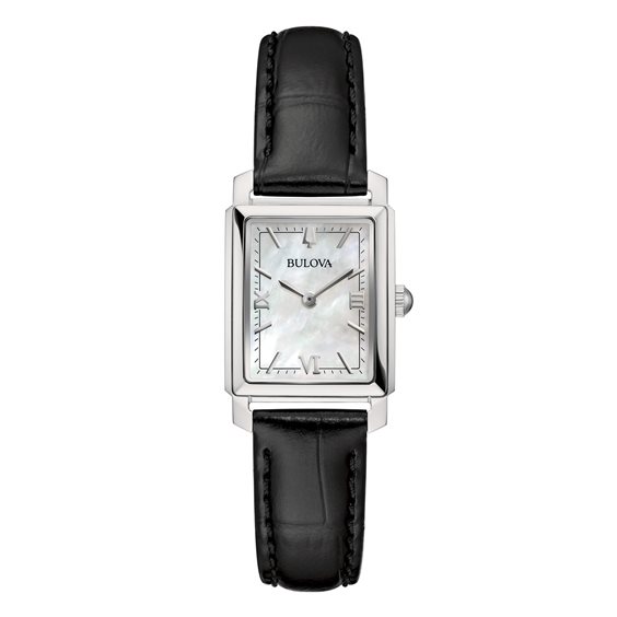 Orologio donna solo tempo modello Sutton Tank. Cassa rettangolare in acciaio lucido. Movimento al quarzo ore minuti. Quadrante in madreperla indici e cifre romane applicate con lancette lucide. Vetro minerale. Cinturino in pelle nera stampa alligatore fibbia con ardiglione e logo. Scatola Libretto e Garanzia 5 anni Originali.