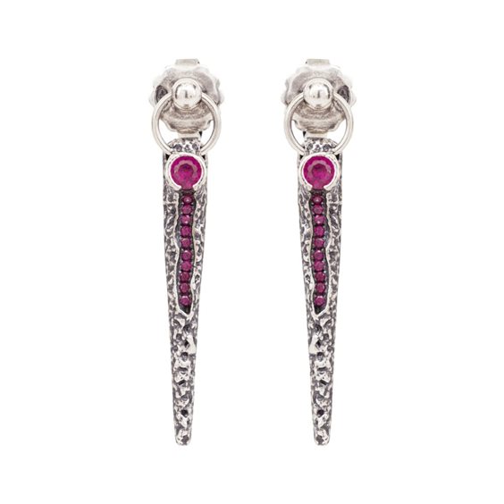 Questi orecchini pendenti, dal design moderno e contemporaneo, sono pensati per una donna dalla forte personalità. Ispirati alla forza e alla maestosità del vulcano, sono realizzati in argento invecchiato e impreziositi da pietre fucsia.