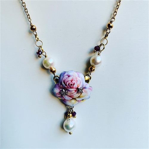 Girocollo con rosa di Gabriella Rivalta,la parte smaltata è realizzata su rame ,viene successivamente montata su un supporto in oro giallo impreziosito da due piccoli diamanti il tutto sostenuto da una catena in oro giallo su cui sono montate perle coltivate e piccoli granati.
