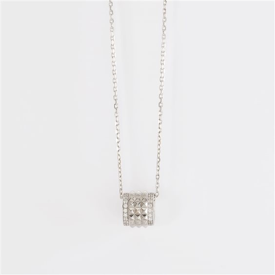 Collana rolò in argento con pendente a forma di cilindro con borchie e zirconi. • Larghezza del cilindro: 10,65 mm • Diametro degli zirconi: 1,5 mm • Larghezza della catena: 1,6 mm • Chiusura con moschettone • Misura unica, lunghezza 45 cm • Materiale: Argento 925, Zirconi