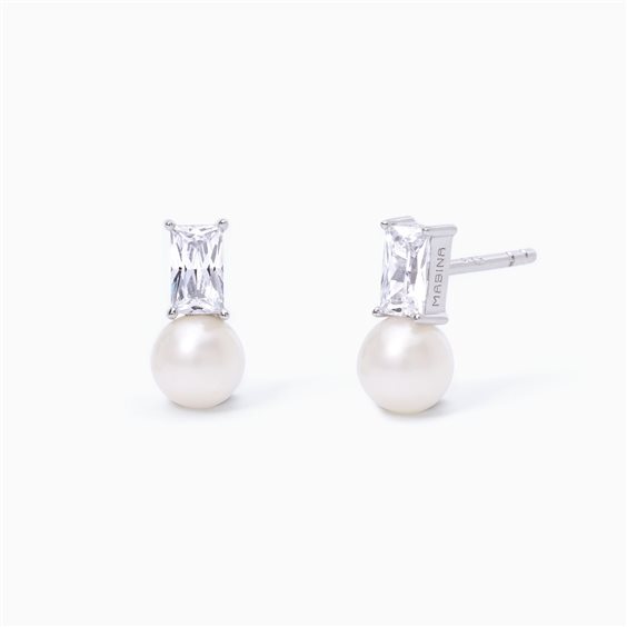 Orecchini argento 925/°°° con perle coltivate Ø 5-5.5 mm e zirconi taglio baguette 5x3 mm, lunghezza 1 cm
