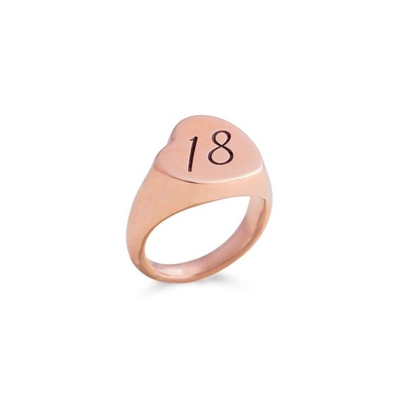 Anello in oro rosa 9Kt con cuore obliquo, nel campione disponibile è inciso 18 ma su ordinazione possiamo incidere anche iniziali o simboli.
