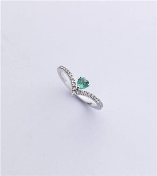 Anello realizzato artigianalmente in oro bianco,smeraldo taglio a cuore di 0,22kt e contorno di diamanti di kt 0,12
